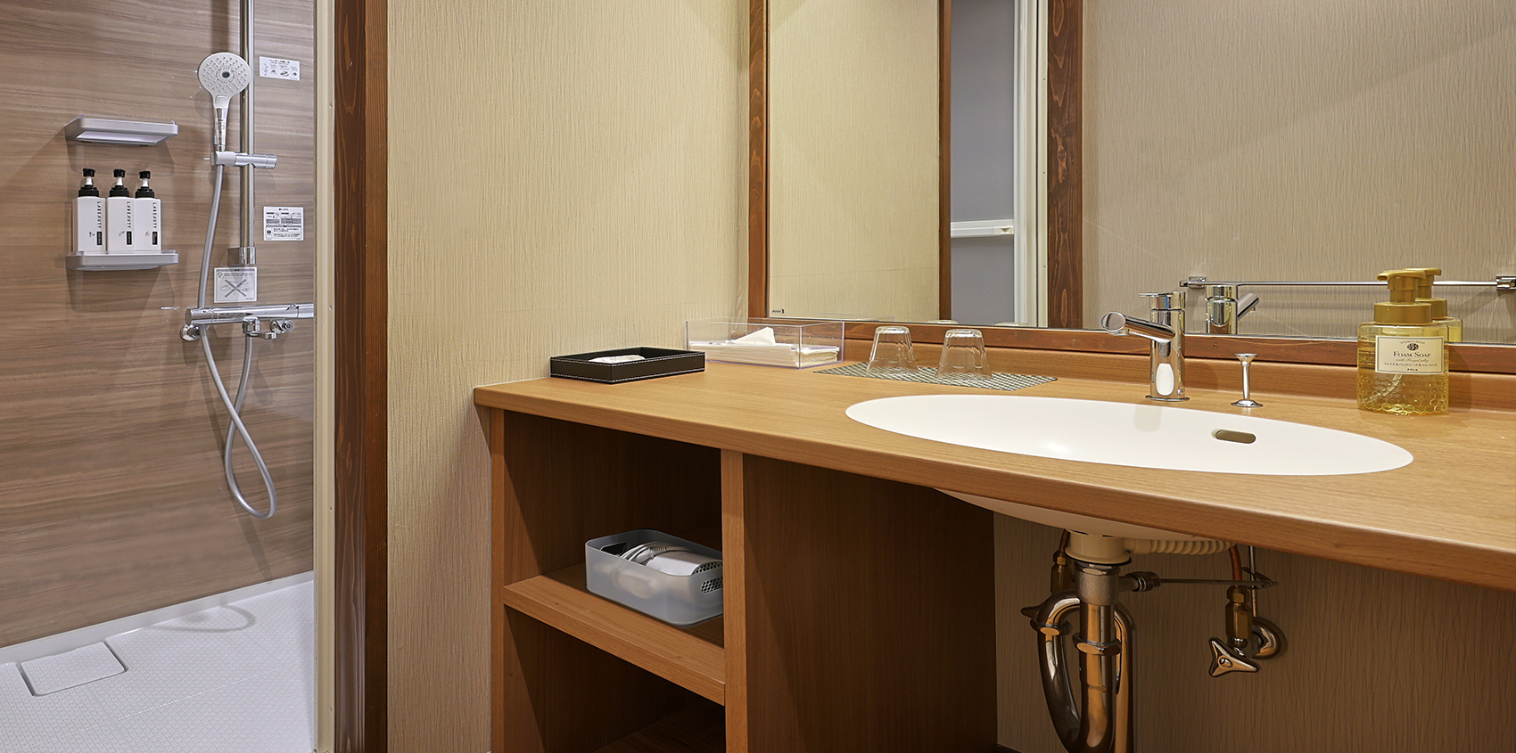 お部屋にお風呂はありませんが、段差がなく安全で使いやすいシャワーブースを設置いたしました。